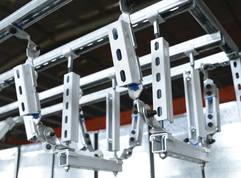 根据标准抗震支吊架和钢筋混凝土结构,应选用锚杆连接,焊接或螺栓连接应选用钢结构。在大跨度网架施工中,选用钢索作为斜支撑,可以解决在合适的标准下在网格结构中安装抗震支撑框架的问题。